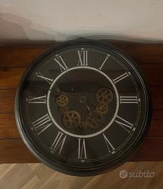 Orologio da parete 55 cm con cornice nera e ingranaggi a vista mobili.