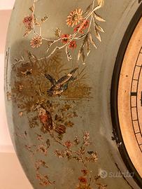 Quadrante con numeri romani, cornice verde salvia decorata con motivi floreali e uccellini.