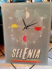 Orologio da parete vintage pubblicitario Selenia Fiat Lubrificanti. Funzionante. In policarbonato. Alcuni segni del tempo. Dimensioni 48 x 36 cm