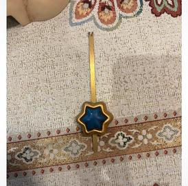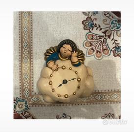 Delizioso orologio da parete Thun in ceramica, con un dolce angelo appoggiato su una nuvola e pendolo a forma di stella blu.