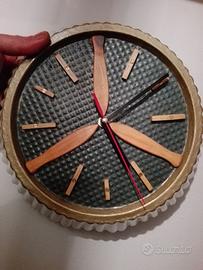 Di tipo artigianale, è un bell'esempio di progetti ecologici-sociali di recupero artistico e reciclo. La base è di metallo da una tortiera vintage mentre le ore sono di legno di noce con vitine di ottone. Il colore rende poco in fotografia purtroppo: si tratta di un bianco lucido attorno, oro alluminio la bordatura e un viride con sfumatura azzurro carta da zucchero lo sfondo.