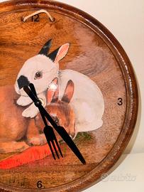 Orologio da parete in legno con dipinto a fantasia di conigli (uno bianco e uno marrone). Perfettamente funzionante, come nuovo. Un orologio dal design classico ed elegante con un tocco creativo e originale. Fatto a mano.