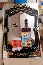 Orologio da parete a specchio pubblicitario "Vecchio Amaro del Capo", come da foto. Ideale per collezionisti del genere. Ottime condizioni, solo una piccola scoloritura dello specchio in corrispondenza delle lancette coperta con un pezzetto di nastro nero, come si vede in foto.