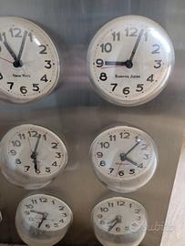 Orologio da parete con 9 quadranti indicanti ognuno l'ora di differenti città. Usato ma in ottime condizioni (è solo necessario pulire i contatti in cui alloggiare le batterie sul retro, come si vede nell'ultima foto).