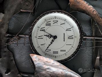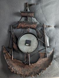 Vero pezzo di design vintage, vendo splendido orologio da parete artigianale realizzato interamente in metallo (ferro battuto/rame) con la forma di un maestoso veliero. L'oggetto non è solo un orologio, ma un’opera decorativa di grande impatto visivo, ideale per arredare salotti, studi o taverne con un tocco nautico e industriale. Dettagli dell'oggetto: Marca quadrante: Artigianfer. Materiale: Metallo lavorato a mano con finiture brunite e riflessi ramati. Movimento: Swiss Quarz (funzionante con una comune batteria AA). Stile: Vintage / Nautico / Steampunk. Quadrante: Numeri romani neri su fondo bianco, protetto da vetro. Stato: Ottime condizioni estetiche, come da foto. NON SO SE FUNZIONANTE Consegna: ESCLUSIVAMENTE ritiro a mano a Torino