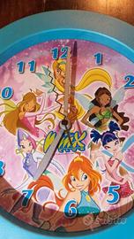 Orologio da parete delle Winx con cornice in plastica turchese e simpatiche lancette, quella dei secondi è a zig zag. Perfettamente funzionante con batteria (non inclusa) in ottime condizioni, può essere una bella idea regalo.