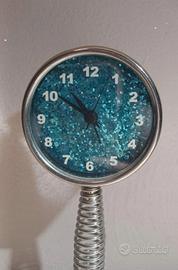 Orologio da scrivania rotondo (7x7cm) con glitter azzurri. Funzionamento a batteria