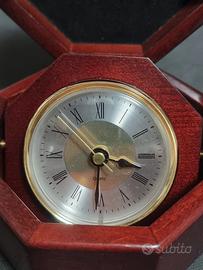 Orologio da tavola in scatola ottagonale in legno con logo "S" sul coperchio.