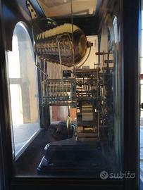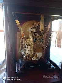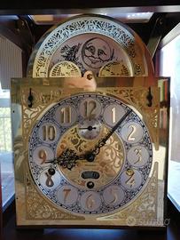 Misure: prof 27,5cm, largh. 36cm, h40cm. Esterno in cristallo e noce anticato scuro, fregi e numeri delle ore dorati. Movimento meccanico a pendolo, fasi lunari, data, segnale orario dotato di meccanismo per tripla suoneria a nove campane su campanelli di bronzo: Westminster, Whittington e St. Michael. Rintocco al quarto d’ ora e rintocchi delle ore all’ora piena, con pratico sistema di spegnimento della suoneria durante le ore notturne. Cristalli molati su quattro lati per potere ammirare la bellezza del meccanismo.
