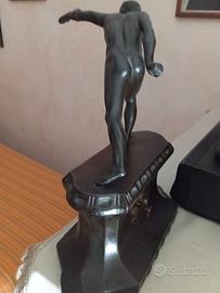 Raro Orologio VEGLIA Borletti Art Déco BRONZO - Trofeo Militare Regio Esercito anni '20 - Funzionante DESCRIZIONE: In vendita un pezzo d'eccezione che unisce alta orologeria, arte scultorea e storia militare italiana. Si tratta di un imponente orologio da tavolo a marchio VEGLIA (Manifattura Borletti), risalente al periodo 1920-1930, in pieno stile Art Déco. LA STORIA: L'oggetto è un autentico cimelio militare documentato: fu vinto come trofeo in un concorso ufficiale tra ufficiali del Regio Esercito Italiano. È appartenuto per tutta la vita a un ufficiale che lo ha custodito con cura durante la sua ascesa gerarchica, fino al grado di Generale. DETTAGLI TECNICI E DIMENSIONI: •Materiale: Scultura monumentale in Bronzo massiccio con patina originale dell'epoca. •Soggetto: Figura atletica (lanciatore), simbolo del dinamismo tipico del design anni '20. •Dimensioni: Altezza 32 cm | Larghezza 26 cm | Profondità 12,8 cm. •Peso: 3,1 kg (estremamente solido e stabile). •Meccanica: Originale Veglia Borletti, PERFETTAMENTE FUNZIONANTE. •Rarità: Include la sua chiave di carica a farfalla originale, dettaglio rarissimo da reperire. CONDIZIONI: Esemplare in condizioni conservative eccellenti. Quadrante pulito, vetro integro e meccanismo revisionato. CONSEGNA E RITIRO (IMPORTANTE): Data la notevole mole (oltre 3 kg), l'antichità e l'estrema delicatezza del meccanismo meccanico, per questo cimelio si predilige e si consiglia il ritiro diretto al domicilio. Questo permette all'acquirente di visionare l'oggetto di persona e garantisce l'integrità del pezzo, evitando i rischi legati ai trasporti dei corrieri.