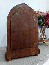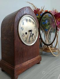 Splendido orologio da tavolo (o da camino) d'epoca, risalente alla prima metà del XX secolo. L’orologio presenta la classica e ricercata forma a "beehive" (arnia) o a cupola, con una cassa in legno massiccio dalla bellissima venatura a vista. Caratteristiche principali: Stile: Classico/Antiquariato, ideale per arredamenti vintage, rustici o studi professionali. Quadrante: Color crema con numeri arabi neri ben leggibili e minuteria a "chemin de fer". Meccanismo: A carica manuale (sono presenti i due fori per la chiave sul quadrante per la ricarica del tempo e della suoneria). Materiali: Cassa in legno (probabilmente rovere o mogano), profili lavorati alla base e piedini a sfera. L'oggetto è esteticamente molto ben conservato, con una splendida patina del tempo che ne autentica l'età. Il vetro protettivo è presente e integro. Dotazione speciale: L'orologio viene fornito con la sua chiave di carica originale d'epoca, perfettamente compatibile con i due fori presenti sul quadrante. Un dettaglio fondamentale per chi desidera un pezzo completo e autentico in ogni sua parte.