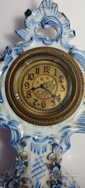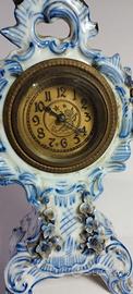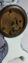Orologio da tavolo antico. Le lancette girano girando la chiavetta dietro, ma non è funzionante. Piccole punte mancanti in alto. Alto 20 cm. Sotto, in un vano, ho trovato una pagina di giornale vecchia, piegata e scritta in tedesco