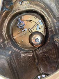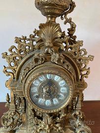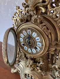 Stile Napoleone III / neo-barocco, con ricca ornamentazione floreale, volute, cimasa superiore e piedini lavorati. Quadrante originale con numeri romani su cartigli smaltati e movimento meccanico a carica con suoneria a campana.