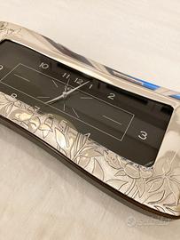 Splendido orologio da tavolo (funzionamento con meccanismo alimentato a pila stilo) con cornice in argento finemente lavorata con motivo a fiori, marca Argentea Casa Reale.