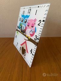 Orologio da tavolo con simpatici gufi innamorati. Quadrante con numeri e lancette ore, minuti. Forma quadrata cm 15 x 15. Usato ma ancora in ottimo stato. Perfettamente funzionante con Pila AA 1,5 volt (non inclusa).