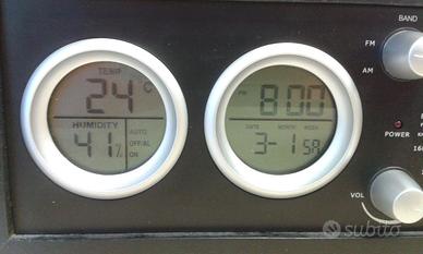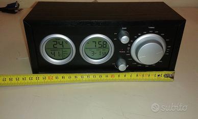 Orologio da tavolo con radio e piccola stazione barometrica colore nero dimensioni compatte in legno stile classico vintage funzionante usato elegante rifinisce molto il avolo di lavoro.