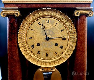 Orologio da tavolo impero a tempietto con quattro colonne e capitelli (in bronzo dorato) in stile ionico in bronzo e legno in radica di mogano inizi del XIX secolo, firmato Lesieur francese di grandi dimensioni e molto pesante, fregi in bronzo dorato con cetre, fiori e sotto e sopra a palmette.