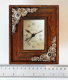 Vendo orologio da tavolo dal design semplice ed elegante, in legno anticato e con un decoro argentato. Ideale per arredare casa o ufficio. Perfetto da posizionare su scrivania, comodino o mensola, aggiunge un tocco decorativo mantenendo praticità e funzionalità.