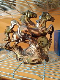 vendo orologio molto decorativo con due cavalli in corsa in ceramica color bronzo. la statua è in perfette condizioni, ľorologio non funziona, bisognerebbe cambiare un pezzo. chi se ne intende può ripararlo facilmente. i miei genitori lo avevano dagli anni 50, forse più vecchio perché c'è scritto made in germany , quindi prima della divisione delle germanie