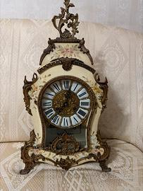 Questo oggetto è un orologio da tavolo in stile Luigi XV, caratterizzato da decorazioni in bronzo dorato e una cassa laccata color panna dipinta a mano con motivi floreali.