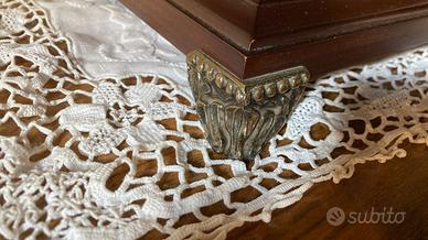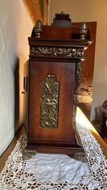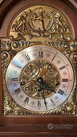Orologio a staffa fine. In ottime condizioni con una bellissima cassa in mogano ed è rifinito con ornamenti fini. L'orologio a pendolo ben funzionante ha colpi a campana sulle ore complete, alle mezze e ai quarti. Il quadrante finemente decorato conferisce a questo orologio a staffa un aspetto ricco.