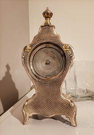 orologio da tavolo antico o vintage con cassa in metallo argentato e dettagli dorati.