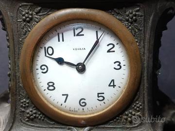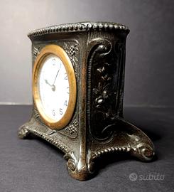 Raro orologio da tavolo con struttura in bronzo decorata con motivi floreali Art Nouveau, primi 900. Quadrante con numeri arabi e lancette nere su fondo bianco. Movimento Veglia Made in Italy (da verificare). Condizione come da foto. Da collezione