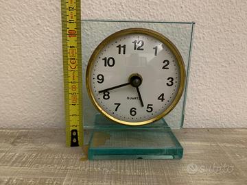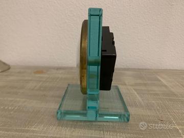 Orologio da tavolo movimento quarzo arabo vintage con movimento al quarzo UTS inserito in una struttura in vetro spesso colore azzurro.