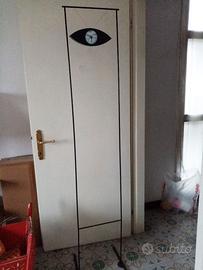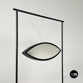 Orologio da terra in metallo e plastica prodotto da Alias nel 1990 ca. (etichetta presente alla base). La struttura del quadrate è a forma di occhio in plastica nera, mentre il quadrate tondo presenta il disegno di un cielo azzurro con nuvole. Sul retro del quadrante è assente uno specchio a forma di occhio (terza foto. Dovrebbe essere come nella quarta foto). L’occhio è tenuto sospeso da due cavi sottili, i quali si collegano alla struttura in tondino di metallo verniciato nero. I due piedini cilindrici sono anche essi in metallo verniciato nero. Buone condizioni, leggeri segni sparsi. Funziona con pila. La struttura è attualmente ricoperta di cartone per non danneggiarla. Misure in cm 38x40x190h