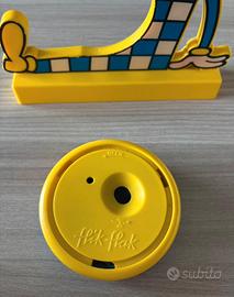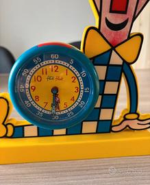 Orologio/ sveglia da tavolo marca Flik Flak da collezione, con supporto in plastica, anno 1992, non funzionante ma volendo si può far aggiustare, colori giallo e blu, da collezione, misure supporto 18x21 cm, diametro orologio 8,5 cm, in buone condizioni. Prezzo 40€ .
