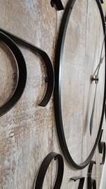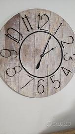 Vendo orologio decorativo da parete con fondo effetto legno chiaro e numeri grandi in ferro.