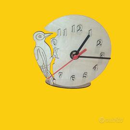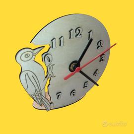 orologio in legno,con base per tavolo/mensola o da parete, numeri in rilievo,movimento lancette silenzioso al quarzo .misure 16x16cm. intaglio su legno.nuovo senza etichetta