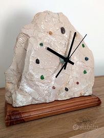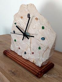 Orologio in pietra naturale tutto fatto a mano. Una vera e propria opera d'arte in esemplare unico. Impreziosito da pietre colorate più piccole ad indicare ogni ora. Un complemento d'arredo dal carattere senza eguali. Base di appoggio in legno in tinta naturale al caffè. Meccanismo al quarzo, preciso e silenzioso. Alimentato con batteria standard tipo AA. Dimensioni 26 x 12 x 26 centimetri.