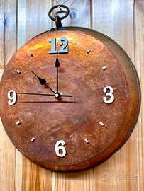 Splendido orologio in rame antico ripulito realizzato conpeltamente a mano da una teglia per farinata. Da parete, numeri in legno di abete. Meccanismo silenzioso. Misure: cm 30x30. Pezzo unico