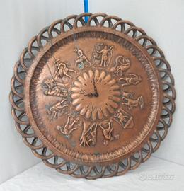 Vecchio orologio in rame sbalzato rappresentante delle scene rurali, dotato di movimento al quarzo e gancio per appenderlo a parete.