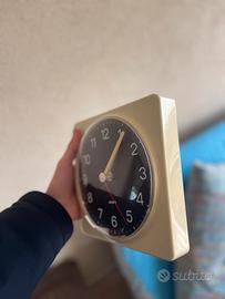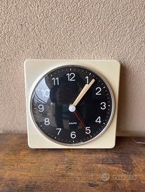 Questo è un orologio da parete vintage Krups degli anni '60 o '70, modello "Comfortime".Presenta un design modernista e iconico con una cassa quadrata color crema e un quadrante nero lucido a contrasto.