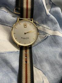 Orologio di Massimo Dutti al quarzo, meccanismo automatico. Water resistant 30 m., quartz mov.t, all stainless steel. Color ori, con braccialetto in tessuto con motivo a strisce colorate. Codice: 4606/902/700. La batteria è stata ora rinnovata come indicato nella foto. In ottime condizioni. Vendo per mancato uso.