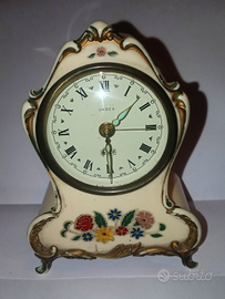 Orologio musicale meccanico primi 900 prod. ditta Reuge - Svizzera - modello Uhrex . elemento unico h. Cm 11 con sagoma lavorata ai fianchi stile Rococo' in bachelite color avorio con decori floreali a rilievo e smaltature color oro ........sveglia /suoneria musicale Tico Tico brazilian music . numerazione romana . lancette a vista notturna . max 40 db . perfettamente funzionante . carica manuale 24 - 36 ore .