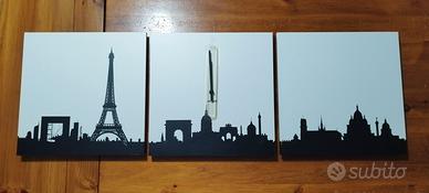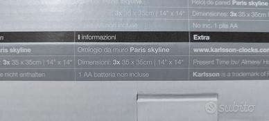 Vendo orologio da parete di design marca Karlsson modello “Paris skyline”. Composto da 3 pannelli con silhouette dei principali monumenti di Parigi (Torre Eiffel, Arco di Trionfo e Sacro Cuore). L’orologio è NUOVO, mai utilizzato. Caratteristiche: 3 pannelli da 35x35 cm Stile moderno minimal bianco/nero Meccanismo centrale Funziona con 1 batteria AA (non inclusa) Ideale per soggiorno, camera, ufficio o come regalo.