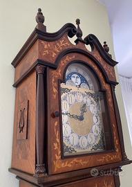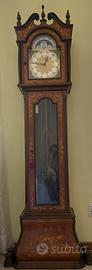 Bellissimo Orologio Pendolo a colonna con calendario e fasi lunari, movimento meccanico 8 giorni, tre contrappesi, suonerie. Cassa in legno intarsiato con varie essenze, anta con chiave, basamento sostenuto da quattro zampe ferine.