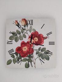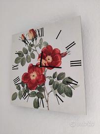 Orologio da parete Legendarte, acquistato da Maison du Monde, 30 x 30 cm, in materiale simil- cartone, raffigurante la rosa balsamina. Molto grazioso e delicato, funzionante con 2 pile, vendo perché non si abbina molto alla mia casa. Presenta un piccolo difetto nell'angolo inferiore sinistro, come visibile in foto, già presente quando mi arrivò imballato a casa.