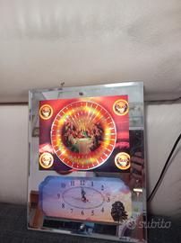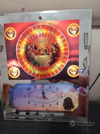 lampada da tavolo decorativa che combina un orologio con un'illustrazione della scena religiosa dell'Ultima Cena, circondata da un effetto luminoso che ricorda una lampada lava o una lampada a movimento, prezzo trattabile