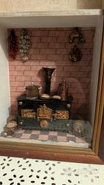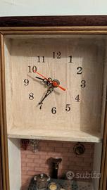 Bellissimo orologio da parete vintage con cornice in legno e vetro protettivo. La parte inferiore ospita un dettagliato diorama tridimensionale di una cucina d'epoca con stufa e accessori in miniatura. Stile: Rustico / Shabby Chic. Condizioni: Ottime, come da foto. Dimensioni: Altezza circa 40 cm. Ideale per: Arredo cucina, taverne o collezionismo. Ritiro a mano o spedizione disponibile.