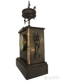 Splendido orologio da tavolo d’epoca in stile Impero, caratterizzato da una struttura elegante in legno ebanizzato con inserti effetto marmo e raffinati dettagli in metallo decorato.