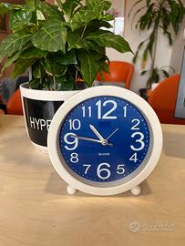 Sveglia orologio vintage con funzione allarme, struttura in plastica bianca con quadrante blu, funziona con una pila stilo.