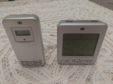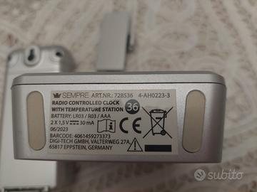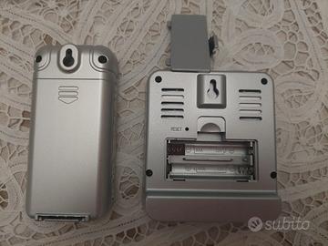Orologio/Termometro radiocontrollato con sensore per la temperatura esterna, in ottime condizioni. Funziona con 3 batterie ministilo AAA per la base e 2 batterie ministilo AAA per il sensore.