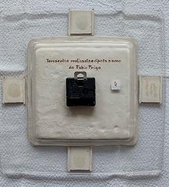 Orologio composto da un bassorilievo in terracotta bianca di cm. 22 x 22 incastonato nell'incavo di un vassoio di vetro delle Vetrerie delle Venezie di cm. 33 x 33. Il bassorilievo e' scolpito, inciso e dipinto interamente a mano e raffigura i piu' noti monumenti storici di Verona che idealmente sorgono dall'Arena per finire nell'abbraccio dalle vecchie mura del colle di San Pietro. Sfiorandolo con le dita si percepiscono non solo i singoli bassorilievi, ma anche i solchi creati dalle incisioni fatte manualmente "a crudo" nell'argilla con una punta metallica per delineare le caratteristiche di ogni singolo monumento.