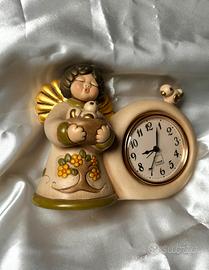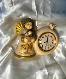 Orologio da tavolo in ceramica prodotto dall'azienda italiana Thun a forma di angelo con un nido e un uccellino, mentre un altro uccellino si trova sopra il quadrante.