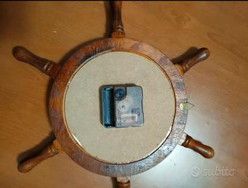 Orologio in legno a forma di timone con conchiglie. Presenta un gancio per appenderlo. Diametro 19 cm