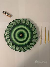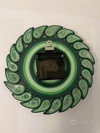 Orologio realizzato interamente a mano con la tecnica del quilling, arrotolando fasce di carta in diverse tonalitĂ di verde.